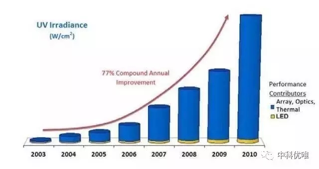 uvled光固化機的輸出功率在最近幾年得到了相當大的提高,從若干家供應(yīng)商所提供的產(chǎn)品指標數(shù)據(jù)可以看出,從2005年到2011年輸出功率的復合年均增長率在5%到10%之間。但對于LED整體表現(xiàn)的評估,另外三個因素對于增加LED的效能更加重要:陣列、冷卻和光學系統(tǒng)。