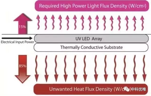 uvled光固化機將15到25%的電能轉(zhuǎn)換為光,這比傳統(tǒng)的汞燈效率要高,但剩下的75%-85%仍然被轉(zhuǎn)換為了熱。因此,必須要保持LED陣列的冷卻。