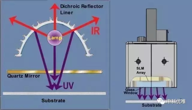 基于最終的應(yīng)用需求,光學工程師必須決定應(yīng)該采用何種形狀、形式以及材質(zhì)來最好地利用LED的獨特性能,然后還需要注意LED是一種泛光形式的光,而不像汞燈模式中紫外光被反射罩反射并指向特定的點并具有一定的聚焦長度。下圖標出了傳統(tǒng)汞燈和UV LED燈在這一點上面的不同。