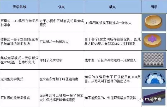 UV LED光源的效能。對于UV LED供應(yīng)商所采用的幾種典型光學方法及其優(yōu)缺點的匯總見下表。