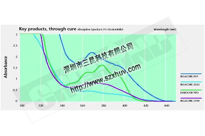 固化機(jī)理中,都是由光引發(fā)劑吸收紫外能量,產(chǎn)生活性基團(tuán),從而引發(fā)體系的聚合反應(yīng)。換句話說(shuō),光引發(fā)劑是否或者吸收哪些波段以及吸收了多少紫外能量,產(chǎn)生了多少活性基團(tuán),是UV膠是否固化,固化效果好不好的關(guān)鍵因素之一。下圖是幾種常見(jiàn)光引發(fā)劑的吸收光譜圖,可以看到不同引發(fā)劑在不同波段的吸收強(qiáng)度是有很大差異的。