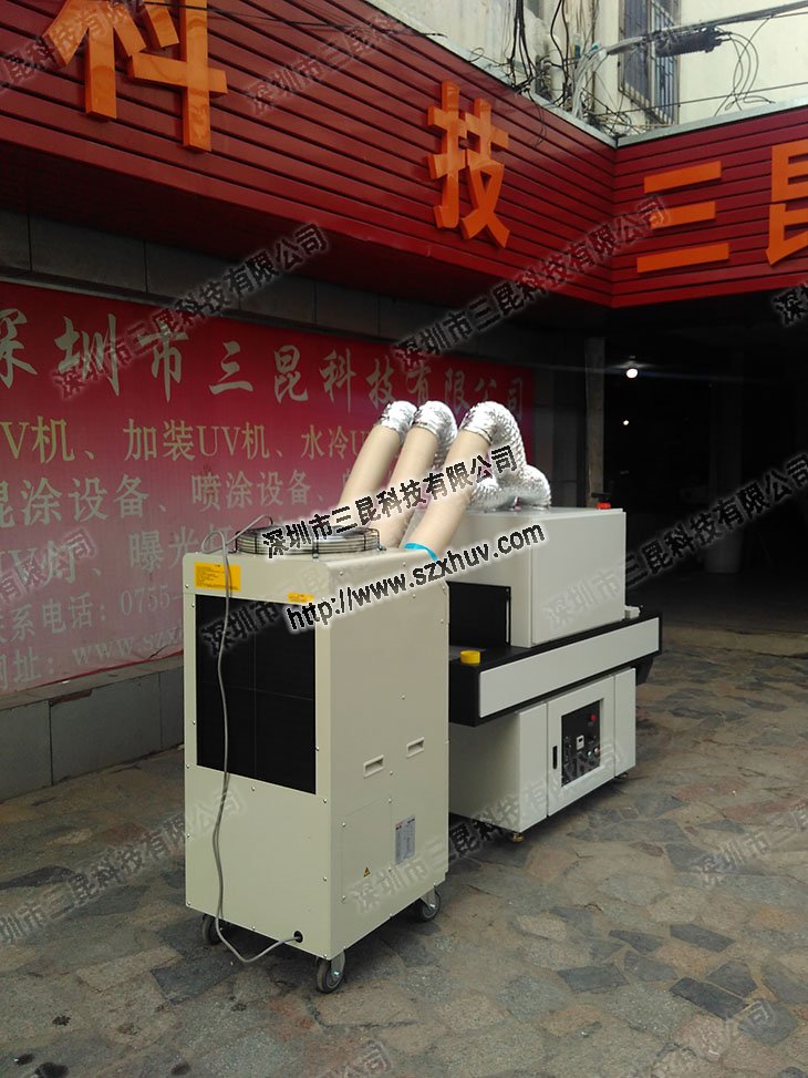 uv固化爐,旁邊的風(fēng)冷輸送機(jī)是客戶提供的。這款移動式冷氣機(jī)SAG-65是三出氣口對