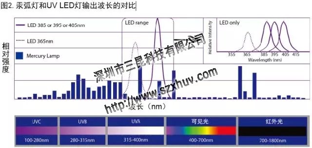 UVLED固化機(jī)的LED以一種完全與眾不同的方式產(chǎn)生UV能量。當(dāng)電流(電子)穿過名為二極管的半導(dǎo)體裝置時,它以量子形式放射出能量。二極管中的特殊材料確定了這些量子的波長。在紫外發(fā)光二極管中,能量輸很典型地處于一個非常狹窄的頻帶內(nèi)(±10納米)。上圖比較了395納米UV LED燈和標(biāo)準(zhǔn)汞弧燈。一個非常重要的發(fā)現(xiàn)就是兩者的輸出強(qiáng)度和波長都不一樣,這種差異對于理解UVLED固化機(jī)固化過程很有意義。