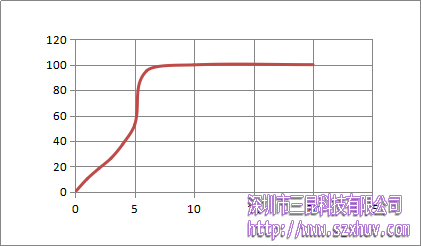 從圖中我們可以看出,固化并非是勻速的,剛開(kāi)始固化稍慢,大約5s的時(shí)候,反應(yīng)速度加快,大概在7s左右時(shí),固化完全。這可能是因?yàn)閯傞_(kāi)始碳碳雙鍵在打開(kāi)時(shí)需要吸收部分能量,而交聯(lián)過(guò)程相對(duì)較快。